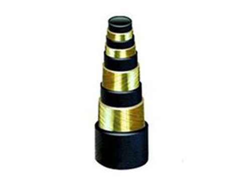 一、高壓鋼絲纏繞膠管產品結構:主要由內膠層、中膠層、2、4、6層鋼絲纏繞層、外膠層組成。內膠層具有使輸送介質承受壓力,保護鋼絲不受侵蝕的作用,外膠層保護鋼絲不受損傷,鋼絲(ф0.3-2.0增強層)層是骨架材料起增強作用。